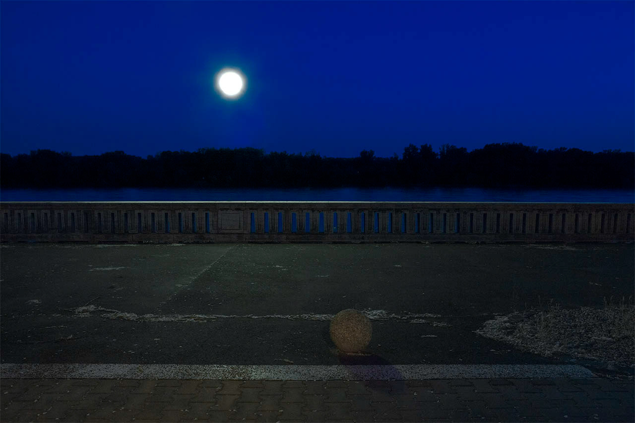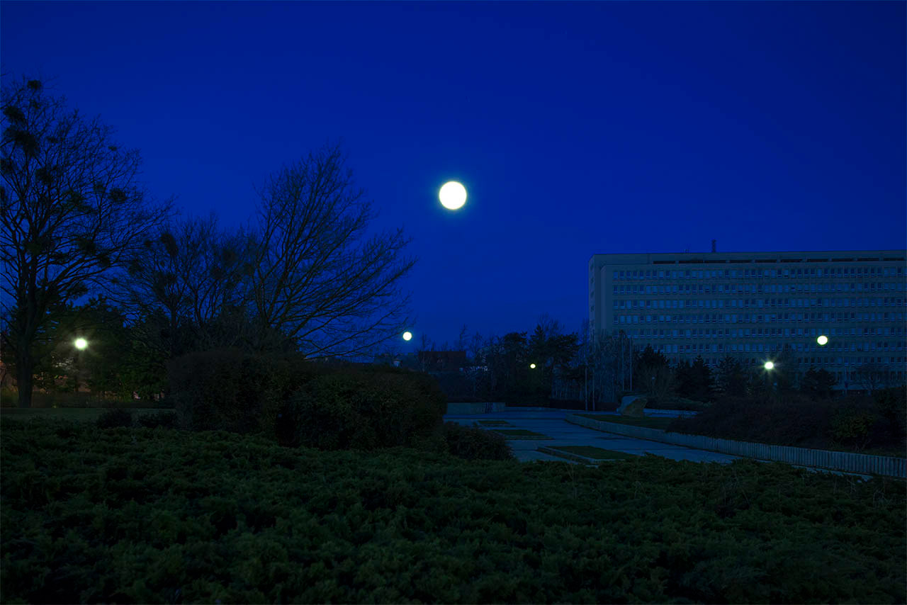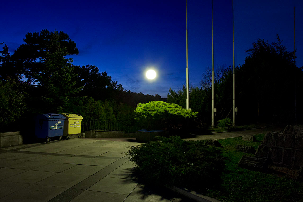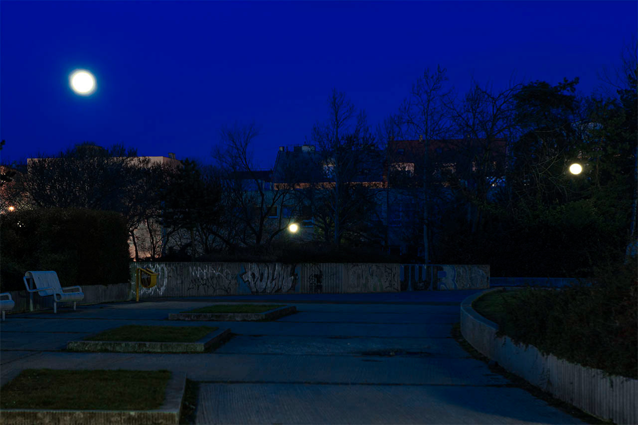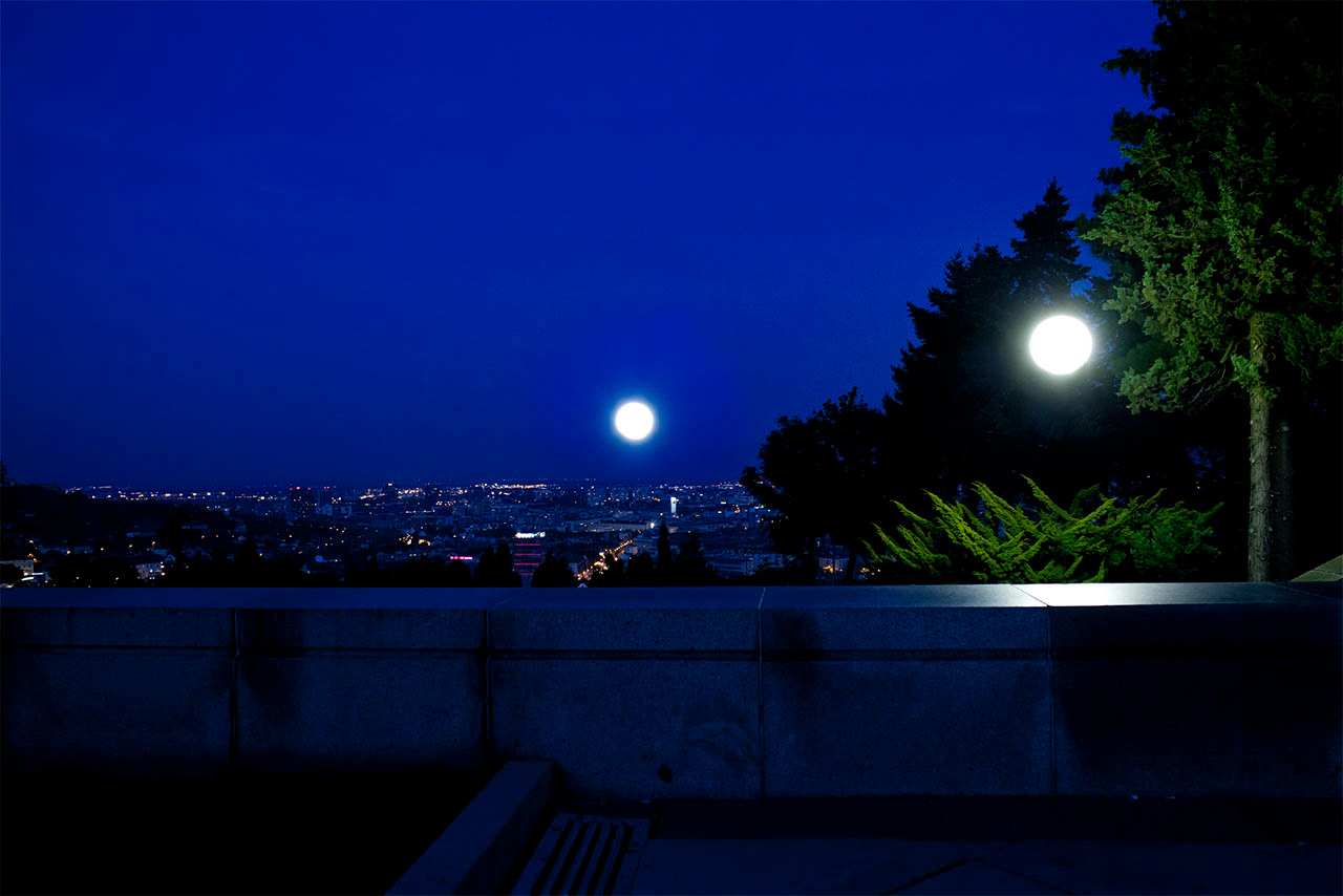 At night, I often mistake the street lamps for the moon. I kept the original location of the lighting, I just removed the columns. One photo shows the moon in its actual position at the time the photo was taken. Can you guess which moon is real?